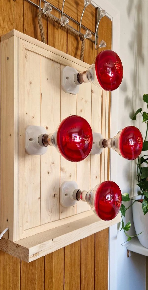 The infrared panels are made from a solid wooden frame with untreated wood cladding at the front and ceramic lamp stems with 4 x infrared incandescent bulbs. No solvents, glues or varnishes are used so there is no off-gassing and are very low EMF. You can choose a 15 min, 30 min or 45 min treatment with our optional timer plug adaptor. How you use your infrared unit is up to you, sit on a stool or lay next to it, hang it on a door with the rope handle (an over-the-door hook is ideal for this) or simply use a bean bag to sit next to it and enjoy the infrared light. The infrared units are handmade to order.